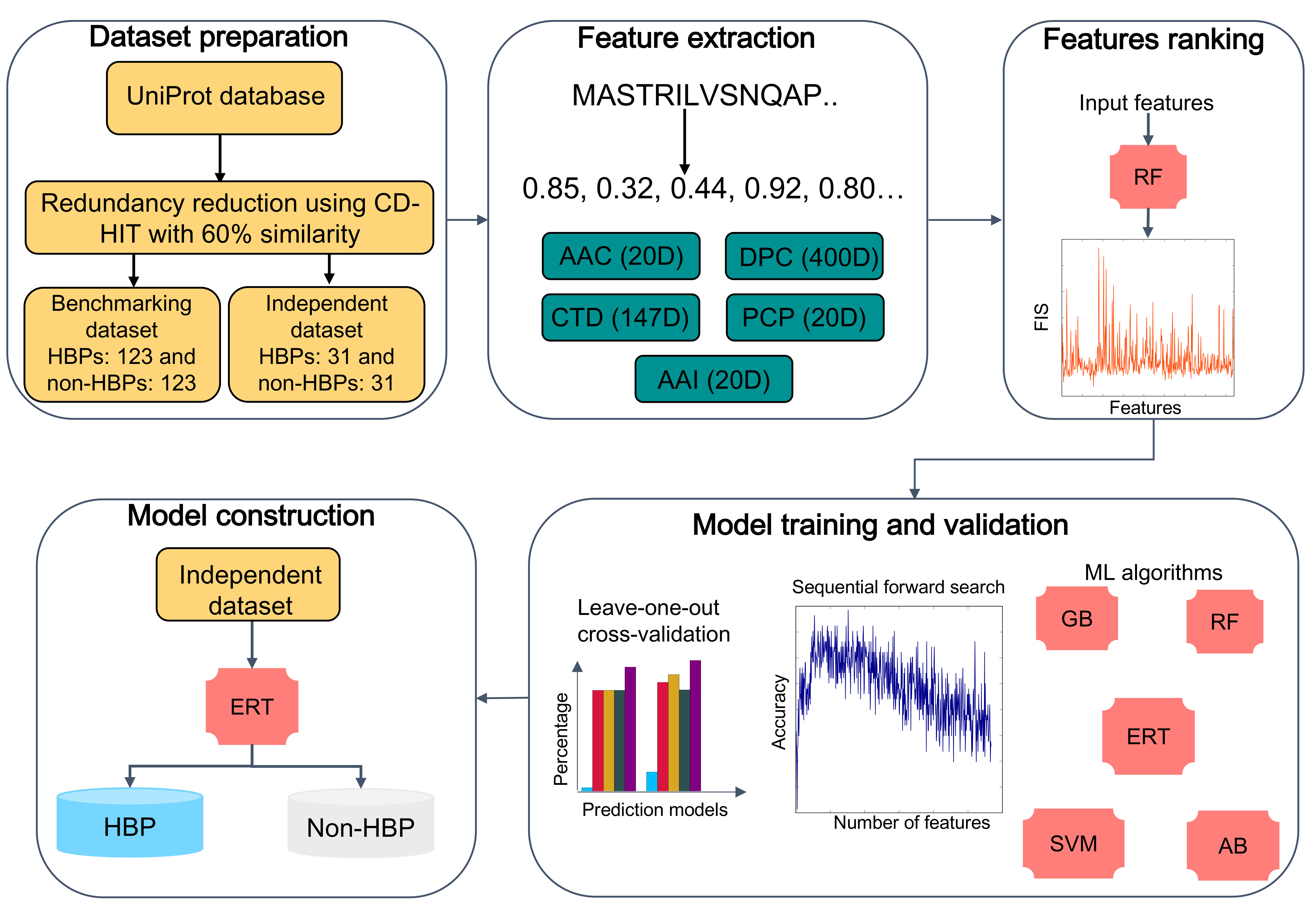 Overview of the proposed methodology for predicting GHBPs that involved the following steps. (i) data set construction; (ii) feature extraction; (iii) feature ranking; (iv) exploration of various machine learning algorithms and an appropriate selection based on the performance produced using sequential forward search; (v) construction of the final prediction model that separates the input into putative GHBPs and non-GHBPs.